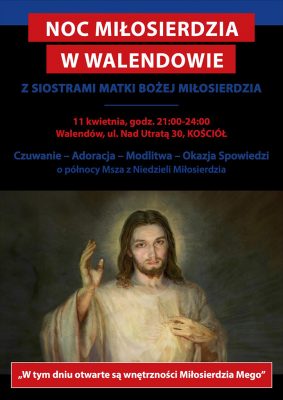 Siostry Matki Bożej Miłosierdzia w Walendowie serdecznie zapraszają do udziału w Nocy Miłosierdzia 11 kwietnia – najbliższą sobotę , w godzinach od 21:00-24:00. Podczas Uwielbienia Miłosierdzia będzie można skorzystać z spowiedzi świętej, usłyszeć świadectwo, rozważać tajemnice Bożego Miłosierdzia oraz uczestniczyć w Mszy Świętej o godzinie 24:00. W międzyczasie można skorzystać z ciepłej herbaty.